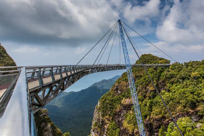 Para chegar a esta ponte curva para pedestres suspensa no meio da mata na ilha de Langkawi é preciso primeiro pegar um teleférico. De lá é possível caminhar por ela e apreciar a rica e verde vegetação local e o mar ao fundo. Ela é suspensa por oito cabos e em seu ponto mais alto tem cerca de 605 m de altura. Ao custo de US$ 1,2 milhão, demorou um ano para ser construída.