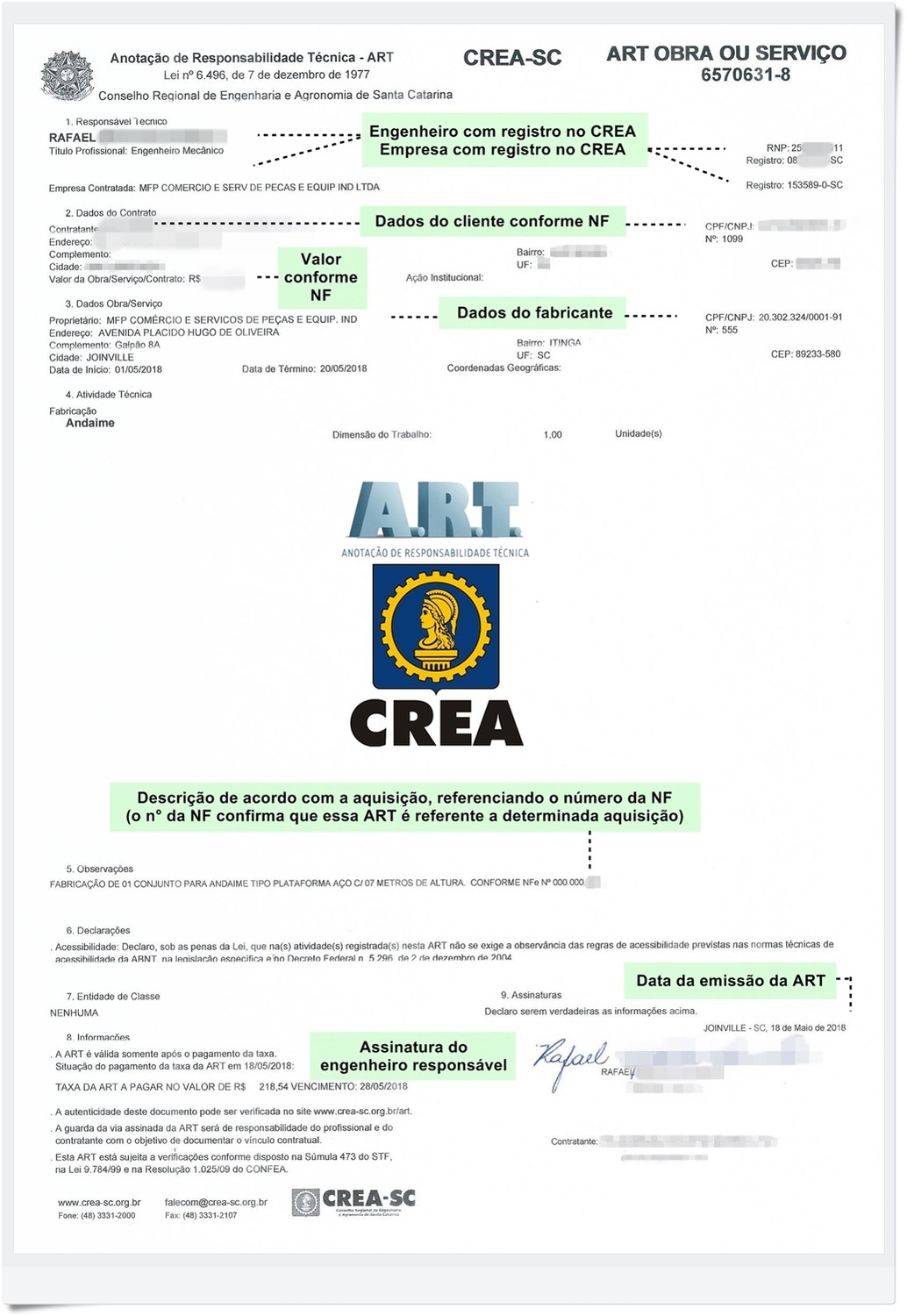 Nós já vimos no mercado, por incrível que pareça, Anotações de Responsabilidade Técnica (ART) sem essas devidas regularidades, com informações totalmente distintas do que tem que ser. Esse documento comprova que o andaime foi devidamente fabricado, porém, você deve verificar e denunciar ao CREA caso haja alguma irregularidade com a ART fornecida pelo fabricante. Veja um exemplo dos requisitos mínimos que uma ART enviada para o cliente precisa ter: