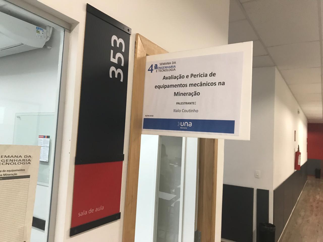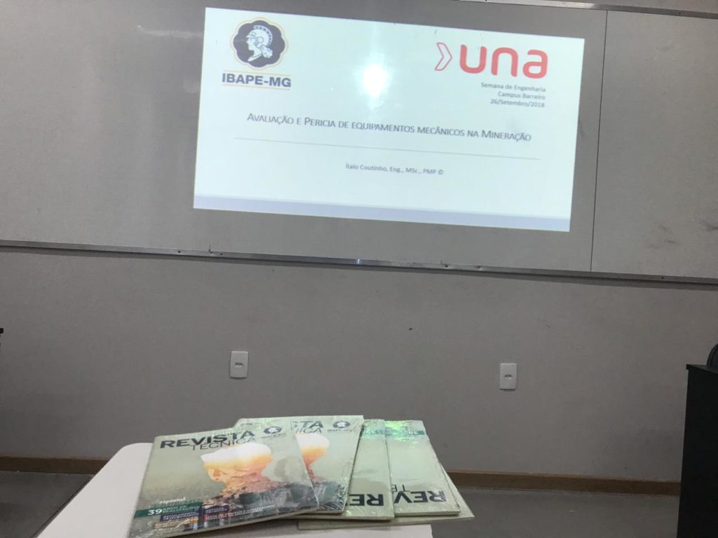 No dia 27 de setembro estivemos presentes na 3a. Semana de Engenharia da UNA Campus Barreiro em Belo Horizonte. Nosso engenheiro associado Ítalo Coutinho apresentou a palestra Avaliação e Perícia de equipamentos mecânicos na Mineração.