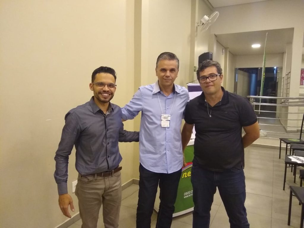 A esquerda o palestrante (Ricardo Átila), no centro o Coordenador do curso de Eng. de Produção Sr. (Rodrigo Bahia) e a direita Prof. e Eng. Metalúrgico Sr (André Costa). Foto: SalettoENG